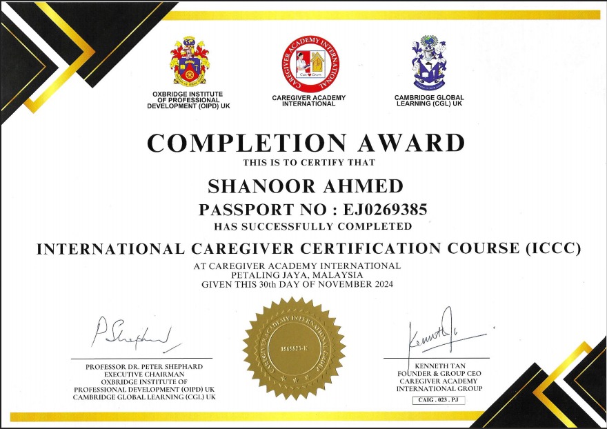 “Our vision is to establish Academies that conduct internationally recognized caregiver courses. Our courses are accredited by Oxbridge Institute of Professional Development (OIPD), UK and certified by Cambridge Global Learning(CGL), UK. All our trainers are highly qualified and experienced within this caregiving industry which is in high demand locally and internationally"